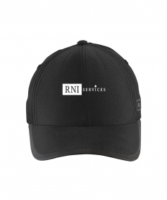 Fabric is 100% polyester pinhole woven mesh with structured profile, mid features, black reflective O heat transfer on side panel black reflective welding on bill, and OGIO seam taping. Low-profile hook and loop with black reflective stacked O heat transfers.