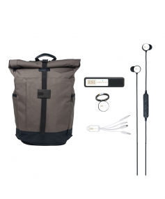 Looking to impress a client or reward and welcome a new employee? It's in the bag with this awesome bundle! Carry, charge, sync and listen with this 5-in-1 bundle option.This 5-piece gift set comes with our best sellers:El Dorado Smart BackpackBudsies wireless EarbudsEnergyBar 2200mAh Power BankArgonot MFI-certified Cord with Micro-USBRingr Smartphone Multi-toolAny or all of the items can be personalized at no additional charge, with no setup charges and only a 1-piece minimum. 25" H x 14" W x 7.5" D